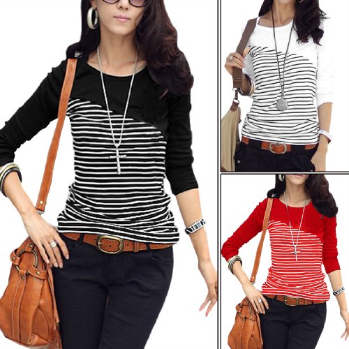 Allegra K Women's Round Neck Long Sleeve Bar Striped Slim Top Shirt