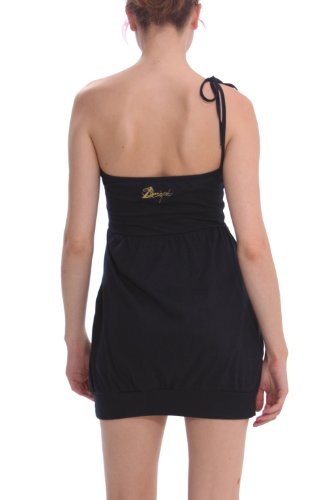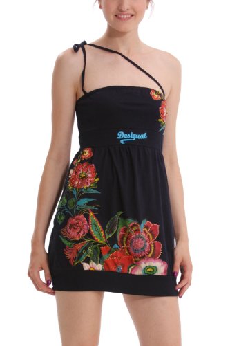 dress ABRIL To show your beautiful shoulders tanned ! Short dress Women That colorful chic Fluid material ultra comfortable Sewing elastic at the top and a strap attached diagonally Loose fit with a bouffant effect due to creases under the waistband Signature embroidered brand Narrow at the bottom by a horizontal band . The flower motifs are adorned with some gold rhinestones Second signature on the back of the golden mark . COMPOSITION 100% COTTON