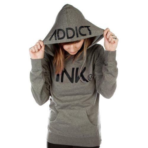 InkAddict women's lightweight pullover hoodie. Features 'INK' print across the chest, 'ADDICT' on the hood. Runs smaller.