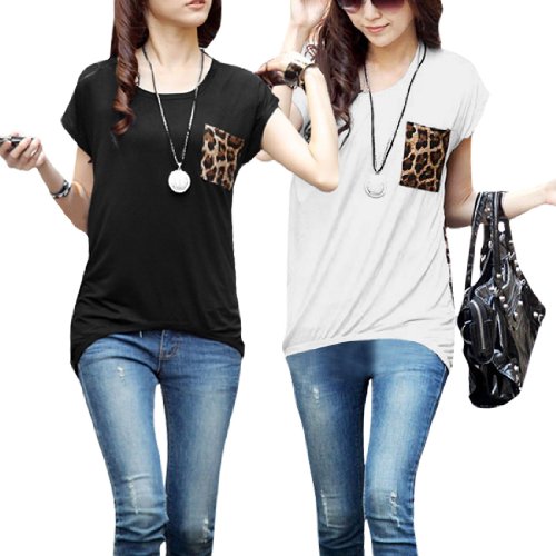 Ladies Leopard Prints Batwing Short Sleeves High Low Hem Shirt