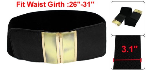 Lady Black Faux Leather Elastic Fabric Interlocking Buckle Waist Belt