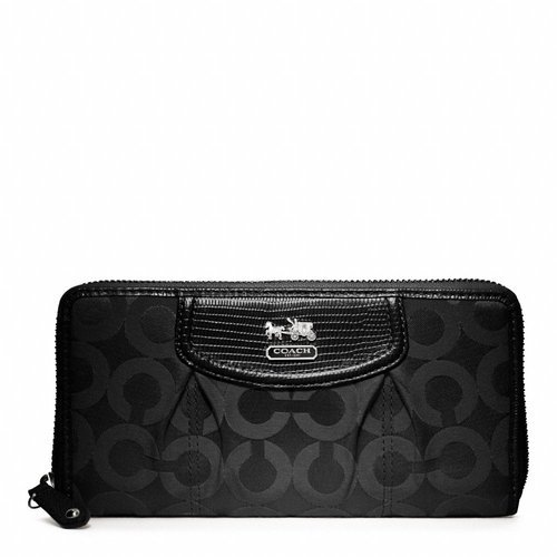 Wrapped in Coach's black Op Art print with lizard embossed black leather trim and polished nickel tone hardware. Fabric is specially treated to repel water. The front features (2) inverted pleats below Coach's stagecoach logo plaque. The interior features 12 credit card slots, 2 full length bill compartments and a zippered coin compartment. The center also features additional full length divided slots. Zip around style measures approximately 7.75" (L) x 4" (H) x 1" (W).