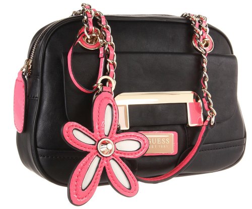 It may be small, but the Guess Aleena Shoulder Bag is not short on style. Measuring 10 1/2 W x 8 H x 2 D inches, this discount Guess shoulder bag is compact and perfect for daily use. Constructed from faux-leather with detailed stitching, this discount Guess shoulder bag opens with a top zip closure featuring a pink zipper pull. Inside, you'll find a spacious interior complete with a zip pocket and three slip pockets to further organize your daily essentials. Carry by the double chain link straps with a 9 inch drop. A front magnetic snap pocket keeps your phone close at hand. Gold-tone hardware, the classic Guess logo plaque and a detachable decorative flower charm add the finishing touches to this discount Guess bag. Purchase your Guess Aleena Shoulder Bag today before supplies run out!