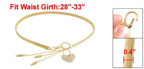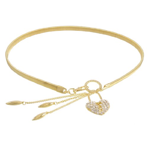 - Ladies gold tone elastic metal waist chain, with shiny rhinestone inlaid metal hollow heart shape circle and long tapered oval beads decor. Lobster clasp closure is for easy wearing and pulling off the belt. Beautiful and graceful waist belt fits for ladies wearing on any occasion to add stylish look. Fashionable and elegant style, wonderful accessory for ladies use to match with divers dresses, long shirts, jeans, blouses, etc.