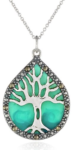 - A polished silver tree of life is set against a blue-green enamel background and framed by glittering dark marcasite in this enchanting pendant necklace.